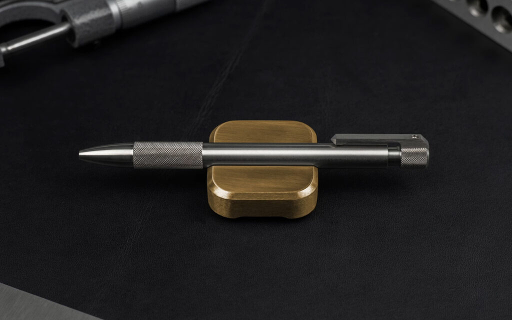 The final piece of the machined puzzle is the modularity of the Journeyman across materials, allowing backers to choose between stainless steel, black steel, brass, and titanium for each of the pen’s components (barrel, crown, clip, and included Pen Rest), and also giving the option for engraving the latter two parts.